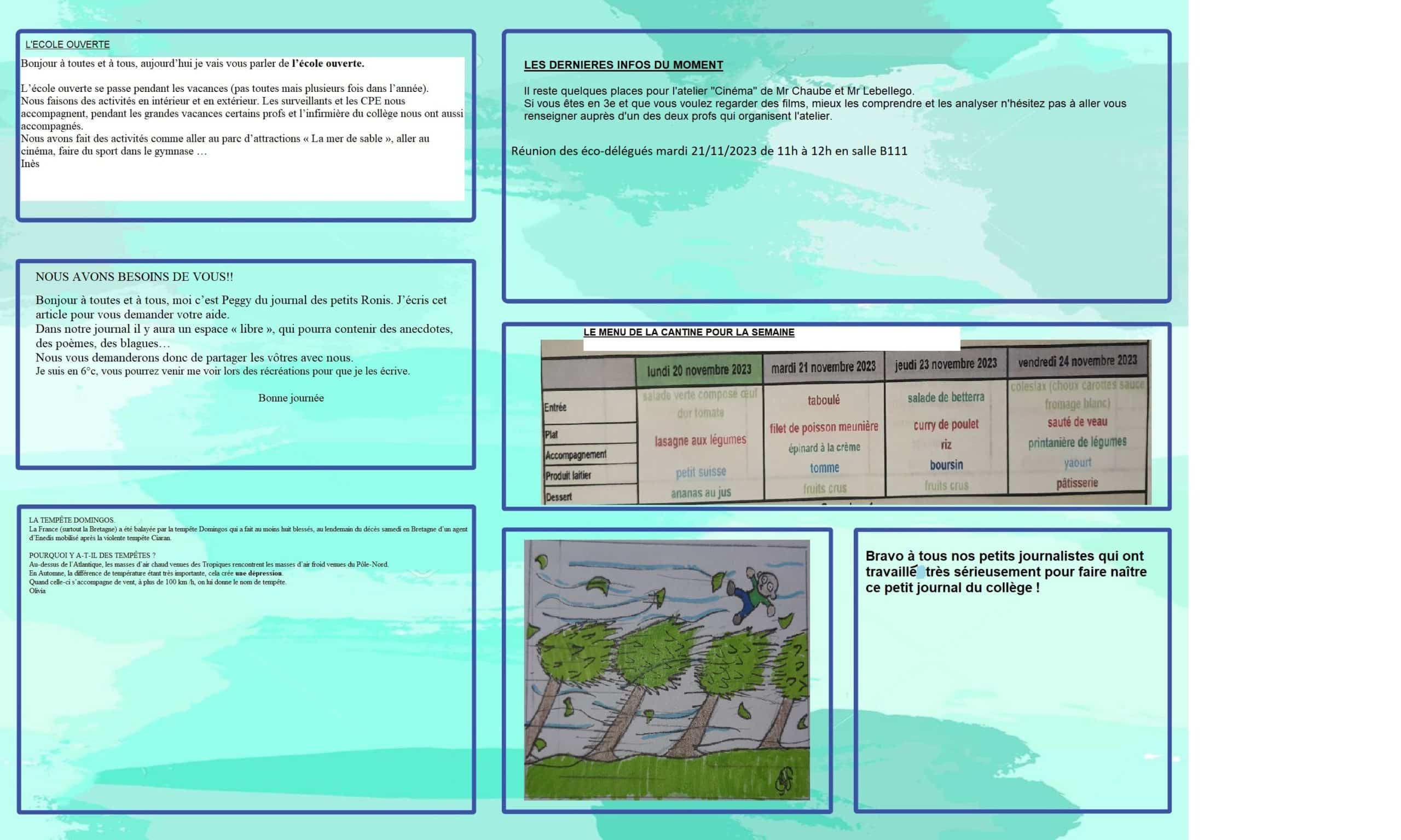 LE journal du collège est enfin disponible !Auteur/autrice de la publication :M MoisanPublication publiée :21 novembre 2023Post category:Actualités !Les élèves de l’atelier « Journal » publient leur premier numéro !Nous vous laissons découvrir le premier numéro du « Journal des Petits Ronis »Inès, Olivia, Haziel, Arthur, Noé, Peggy, Aya, Djehouty, Sophiane et Marcel. Vous devriez également aimer Informations séjour ski 5ème 3 novembre 2025 Fédérations parents d’élèves 10 novembre 2020 Réunion information ski 15 décembre 2023